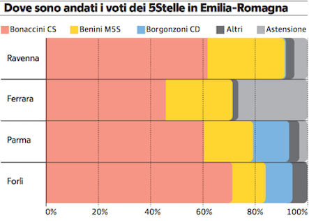 Particolarmente modesto è il risultato cinquestelle a Forlì mentre a Ferrara, rimasta al centrodestra, solo poco più del 40% dei voti ex cinquestelle si dirige al Pd. Qui, però, quasi un terzo del voto cinquestelle alle politiche di due anni prima sembra essersi rifugiato nell’astensione. Un panorama che riflette situazioni locali differenziate evidenziando indirettamente la fragilità del progetto politico e la volatilità della sua potenziale area di consenso.