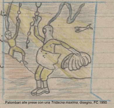 Sono andato a colpo sicuro, la mia memoria anche visiva per ritrovare le cose è notevole, per cui in una cassapanca della veranda, utilizzata normalmente come piano d’appoggio della cesta della biancheria, malgrado il parere contrario di mia moglie, ho effettivamente ritrovato i recipienti in cui erano ben chiusi i due per me cari e preziosi cimeli. Esaminarli e leggere l’opuscolo ci consente di scoprire usi, modi d’uso e caratteristiche di questa invenzione che poi ha tanti punti di contatto con altre consimili che servono appunto a respirare in ambienti inadatti a tale funzione umana, nati e diffusisi dai primi del ’900 e divenuti con i loro “accessori” strumento importantissimo di offesa e di difesa. La maschera, dalla Grande Guerra ’15-18 alla Seconda Guerra Mondiale, simile come concezione, ha però avuto vari cambiamenti e miglioramenti tecnici, soprattutto nei materiali, divenuti più sicuri e confortevoli, ed è di questa che l’opuscolo del 1939 ci fornisce ogni dettaglio e lo vedremo. Esattamente mia coetanea, la maschera Pirelli tipo “PIR. 35” è rimasta, con altre anticaglie ingombranti, in quella cassapanca, avendoci seguito nei due traslochi avvenuti da allora. È stata una mia compagna di giochi o meglio è stata proprio un gioco della mia infanzia. La indossavo – naturalmente mi stava un po’ larga ma non troppo – ed ecco che diventavo immediatamente un palombaro. Infatti, non immaginavo scenari di guerra con l’uso originario dell’apparecchiatura, il sogno che realizzavo e ripetevo anche nei miei disegni, era quello di “fare” il palombaro e così mi immergevo in acque fantastiche, in mari misteriosi, fluttuando silenziosamente e avanzando su fondali lussureggianti di alghe, di coralli e madrepore, tra pesci, crostacei e altri animali marini, alla ricerca di galeoni spagnoli affondati che custodivano bauli chiodati, vere e proprie “casse forti”, piene di tesori preziosi d’ogni genere.