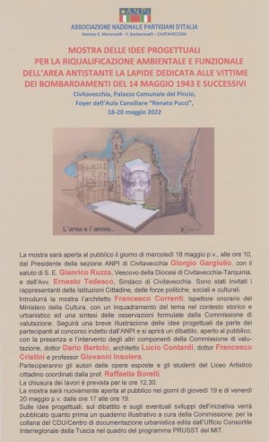 Finalmente, il giorno di mercoledì 18 maggio, alle ore 10 della mattina, a Civitavecchia, al Comune, cioè nel Palazzo Comunale del Pincio, a piano terra, nel foyer dell’Aula Consiliare “Renato Pucci”, accessibile dalla Piazza Pietro Guglielmotti, aperta a tutti, sarà inaugurata la Mostra delle idee per la riqualificazione ambientale e funzionale dell’area antistante la lapide dedicata alle Vittime dei bombardamenti del 14 maggio 1943 e successivi, ossia lo spazio della piazzetta dietro la cattedrale di San Francesco, all’angolo tra Via Giuseppe Mazzini e Via Gorizia, oggetto del Concorso pubblico indetto nel 2019 dall’A.N.P.I. e concluso con il lavoro della Commissione istituita per esprimere alcune valutazioni in relazione alle ipotesi operative contenute nel bando.
