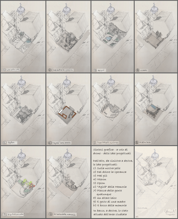 - Sulla nostra pelle – Il progetto, attraverso la rete di giunture della pavimentazione in pietra e la sua illuminazione a terra, dal luogo una forte drammaticità ed una capacità evocativa che si coniuga però attraverso sedute, rampe e gradini, con una nuova opportunità di fruizione quotidiana dello spazio pubblico, trattato con segni puliti e misurati, rispettosi del contesto.
