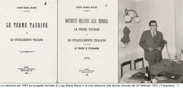 Discendente di una nota famiglia civitavecchiese, nipote di Pietro (l’autore di quello Stato antico ed attuale del Porto,Città e Provincia di Civitavecchia che è la prima opera di archeologia scientifica sulla città) e di Guglielmo (letterato di valore, ingiustamente più noto per l’appellativo di “Ser Pecora beccaio” impressogli astiosamente dal Leopardi), Luigi Maria Manzi lottò per quarant’anni con il Comune di Civitavecchia, nel tentativo di convincere la municipalità a far proprio il suo progetto di un grande stabilimento termale presso le sorgenti, vicino agli antichi e grandiosi resti archeologici. Ottenuta la licenza, con il benestare del Ministero delle Belle Arti e del Commercio dello Stato Pontificio, nel marzo 1852, egli dovette soprassedere dall’impresa per l’impegno, quale amministratore delle Strade Ferrate Romane, richiestogli della costruzione della Roma-Civitavecchia-Orbetello e della Roma-Ancona-Bologna.