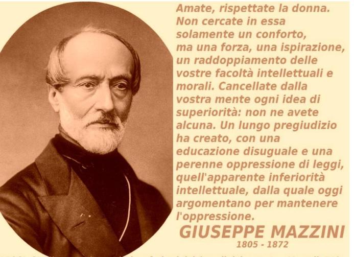 Educazione, associazione, emancipazione sono concetti costanti del pensiero mazziniano, soprattutto se declinati al femminile: le donne devono educarsi ed essere educatrici di valori, devono associarsi per dare forza al proprio impegno sociale, le donne non debbono essere estranee alla politica per diventare cittadine consapevoli e attive. L’esercizio di una cittadinanza politica da parte delle donne attraverso il voto diviene obiettivo dei mazziniani già a partire dalla metà dell’Ottocento: Mazzini stesso non mancò in diverse occasioni di farsi sostenitore del suffragio femminile declinandolo all’interno di un processo di emancipazione delle donne finalizzato, nello specifico, al successo della causa unitaria e all’affermarsi di una nazione veramente moderna.