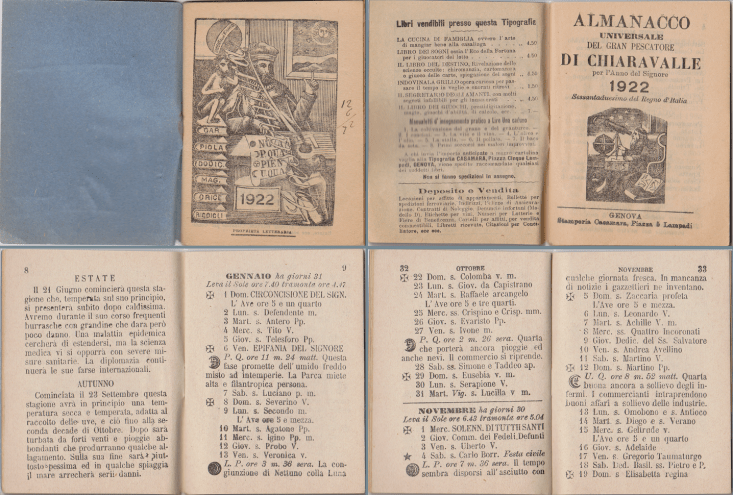 Questi giorni tra la fine di settembre e l’inizio di ottobre dell’anno 2022 d.C. (di grazia, del Signore? probabilmente horribilis per alcuni) sono stati segnati da avvenimenti per vari aspetti memorabili, compresi eventi che si possono definire epocali, con varie novità, sorprese, forse ricorsi storici, che danno sempre di che scrivere o di che parlare. Ma la mia fonte di ispirazione per il mio appuntamento settimanale con il Blog (un impegno piacevole ma non semplice), come in tanti altri casi, è stato l’ennesimo “ritrovamento” non del solito manoscritto ma di una piccola collezione famigliare di almanacchi, calendari, lunari. Senza alcun riferimento (giuro! Honi soit qui mal y pense! per restare oltremanica) ad una nota, pregevolissima rubrica storica pubblicata su questo stesso Blog e altri social. Ed uno degli almanacchi d’uno, credo, dei miei nonni è dell’anno 1922. Da lì le immagini in copertina.