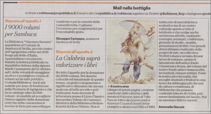 La figura qui sotto riproduce due lettere pubblicate sul supplemento del sabato al quotidiano «la Repubblica» (Rubriche. Mail nella bottiglia, in «la Repubblica Robinson», sabato 22 ottobre 2022, n° 307, p. 10), che ho letto con molto piacere, perché si tratta di due risposte positive ad un appello. Chi volesse saperne di più faccia le sue ricerche. Cosa voglio dire? Anche in questo caso, termino, senza aggiungere altro.