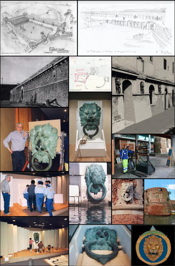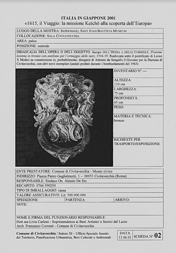 Che dispone, a circondare lo specchio d’acqua, quasi un centinaio di celle per magazzini (non ancora frigorifere), a ricordo di Centumcellae e degli edifici visti da Rutilio Namaziano, con un arsenale a dieci navate – o rimesse per le galere della flotta – e dieci nicchie semicircolari sulla calata di attracco, dove disporre le dieci teste di leone con gli anelloni medicei. Dieci leoni per Leone X. Numeri simbolici. Ma i 500 erano molto concreti. Perché in realtà 500 (cinquecento) erano i milioni di vecchie lire del valore assicurativo stimato quando, a settembre/ottobre del 2001 (pochi giorni dopo il tragico giorno 11!), abbiamo spedito il Mascherone, insieme ad altri preziosi cimeli e opere d’arte, al Museo Juan Bautista di Ishinomaki, prefettura di Miyagi, Giappone, per la mostra “1615, Il Viaggio, la missione Keichô alla scoperta dell’Europa” nel quadro delle manifestazioni di “Italia in Giappone 2001”.