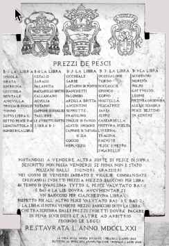Altra memoria “gastronomica”, è la copia di una lapide datata 1771 esposta a Civitavecchia sulla facciata di un palazzo nei pressi del Comune. Riporta scolpiti i nomi di molti pesci e i relativi prezzi, diremo calmierati, molti pesci dei quali oggi non sono “comuni” o quantomeno frequenti sulle tavole locali. Alcuni di quelli nominati sono pressoché assenti anche nel mare della costa civitavecchiese: