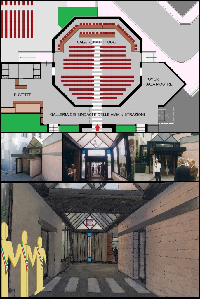 Anche in questo caso, il modo e la forma di questa rappresentazione potranno essere oggetto di un concorso di idee o di altro genere di partecipazione del pubblico, come per il “Viale della Storia civica“. Le idee in proposito possono essere innumerevoli. Nel mio disegno della figura 2 ho voluto sintetizzare in maniera allusiva un elemento di supporto, ad esempio delle sagome in legno grezzo a metà strada tra le silhouette alla Mario Ceroli e le catene di omini di carta che si tengono per mano, ma senza alcuna finalità di soluzione concreta. Tutto è possibile immaginare, dalla lapide alla “fotografia formato tessera”, in modo che Sindaci e Amministrazioni abbiano nella sede del “massimo consesso cittadino” un segno, un distintivo, un ricordo. Eviterei le erme marmore, i “BUSTI” della rimembranza… Sono certo che la soluzione ottimale potrà essere trovata, ancora una volta, ricorrendo alla versione femminile, ovvero aprendo le “BUSTE”, cioè le buste con l’