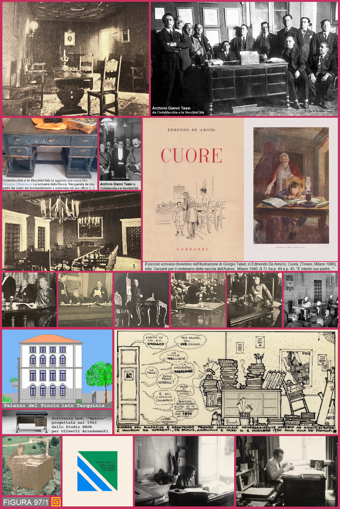 L’assonanza del titolo della puntata con una delle canzoni più orecchiabili della nostra vita di telespettatori (Nota 1) mi ha indotto all’esordio “cantabile” che riassume e rende conto del breve dialogo a distanza svoltosi tra profili Facebook nei giorni scorsi. La pubblicazione sulla pagina di CivitaVecchia e le VecchieCittà di una foto, tra altre dell’Archivio Gianni Tassi (figura 1), d’un podestà di Civitavecchia (Francesco Cinciari, Ilario Cordelli, Ernesto Del Greco?) seduto ad una scrivania attorniato dai suoi collaboratori negli anni Trenta, mi ha fatto ritornare d’un balzo al mio primo giorno di servizio a Civitavecchia e poi a tutti quelli seguiti al lavoro di “piccolo scrivano”, che in effetti di pagine manoscritte, dattiloscritte e digitate in vari modi ne ha al suo attivo davvero tante, in questi ultimi cinquantasei anni.
