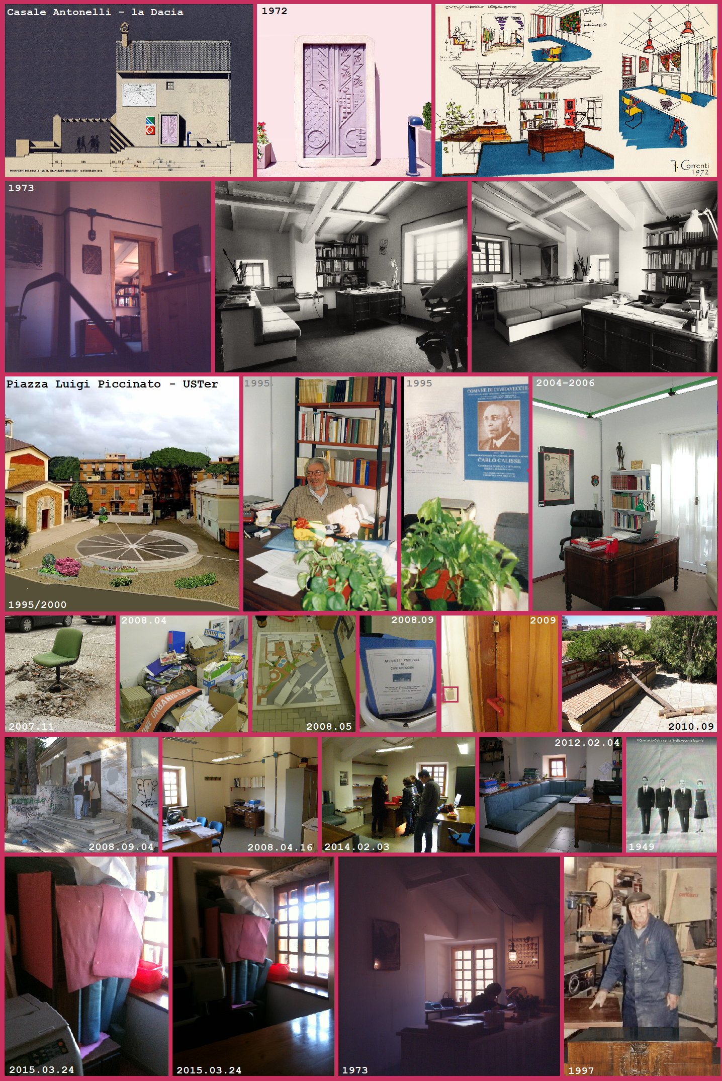 Qui devo aggiungere anch’io gli stessi puntini di prima… aggiungendo anche, però, che da questa rivelazione non ho tratto alcuna conseguenza, nel senso allora atteso nell’ambiente. Mi sono tenuto la scrivania, ci ho lavorato sempre per tutti i quasi quaranta anni di servizio, portandomela dietro nei vari traslochi che le vicende dell’ufficio hanno comportato e qui ne mostro la lunga vicenda comune nelle tante illustrazioni delle due figure con date e richiami “storici”. Dopo la prima sede al Pincio, il primo trasloco fu nella nuova sede, realizzata con qualche scandalo dei benpensanti nel vecchio casale (con stalla) abbandonato del futuro parco pubblico che – proprio in quel periodo, tra il 1970 e il ’72 – avevamo acquisito alle proprietà del Comune, incamerando i terreni dell’antica Vigna Antonelli, con il suo viale dai 100 pilastri, che immediatamente mi diede da pensare e che avrei poi scoperto essere un tratto dell’Aurelia Nova traianea. Così per molti anni, fino al trasferimento nella sede a monte della “Mediana”, nel quartiere GesCaL, davanti alla chiesa di Gesù Divino Lavoratore, in quella piazza che in seguito riuscirò a far intitolare al mio docente di urbanistica, ideatore del quartiere e autore del PRG, il professor Luigi Piccinato. Nel ’97, nuovamente al Parco della Resistenza, ma mantenendo la sede “Piccinato”, utilizzata dal ’99 al 2006 per l’Ufficio Consortile Interregionale della Tuscia e le progettazioni con i giovani borsisti del PRUSST.