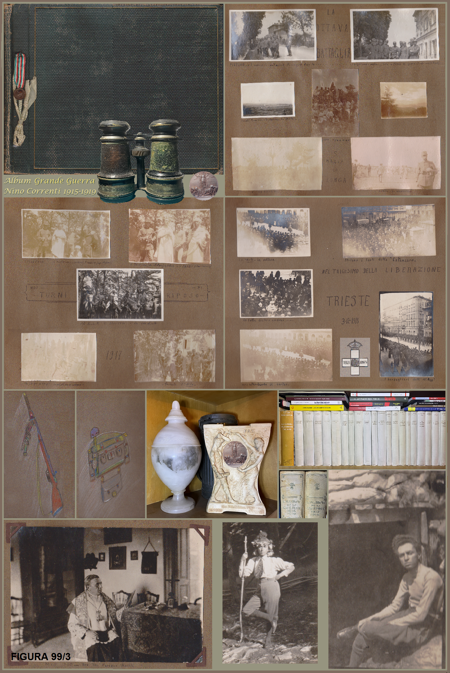 Un armadio della sua biblioteca (disegnata da lui stesso), che è ancora presente nella mia casa, accoglie gli album di fotografie dell’intera esistenza, testimonianze preziose non solo di fisionomie e vicende famigliari ma soprattutto di avvenimenti, costumi e situazioni di luoghi e tempi oggi di grande interesse storico e sociale. Sette sono gli album fotografici degli anni di guerra, decorati da nastrini e medagliette, ciascuno di 25 pagine per un totale di oltre un migliaio di scatti. Ne do qualche immagine nella figura 99/3, in cui il Lettore può vederne una copertina e alcune pagine, qualcuno dei disegni di abbellimento e vari oggetti-ricordo, come la piccola urna d’alabastro con la «Terra del Carso», un binocolo, un soprammobile celebrativo della «PAX». Molte fotografie hanno subito in questi anni alterazioni o sono scolorite. Provvederò a restaurarle, ma per fortuna, molti anni addietro, quando lo stato di conservazione era buono, avevo scansionato gran parte delle pagine degli album. Di souvenir di quell’esperienza così incisiva e memorabile, peraltro, mio padre me ne ha lasciati diversi, oltre ai suoi racconti di episodi vissuti, di pericoli corsi, di ferite e malattie avute, sullo sfondo di scenari ed eventi storici, che ho ascoltato fin da bambino. Imparando anche a conoscere i luoghi di allora, dove mi ha portato (Trento e Trieste, il Piave, il Carso, Redipuglia, Monte Grappa…) e i nomi di persone, che mi ha fatto conoscere di persona, come il “suo” colonnello Achille Sirchia, di Cagliari, divenuto generale, con il quale gli scambi di lettere, di doni e di visite si sono protratti “fino all’ultimo”. Conservo proprio nella biblioteca un pregevole artistico scrigno (giunto intorno al 1960), al cui interno una piccola busta indirizzata a papà racchiude un biglietto autografo che dice: «Cagliari, ? / Caro Nino, ti prego gradire questo modesto oggetto quale mio ultimo ricordo terreno e in memoria della nostra più che fraterna amicizia. / Tuo Achille». Altri tempi, altri sentimenti…