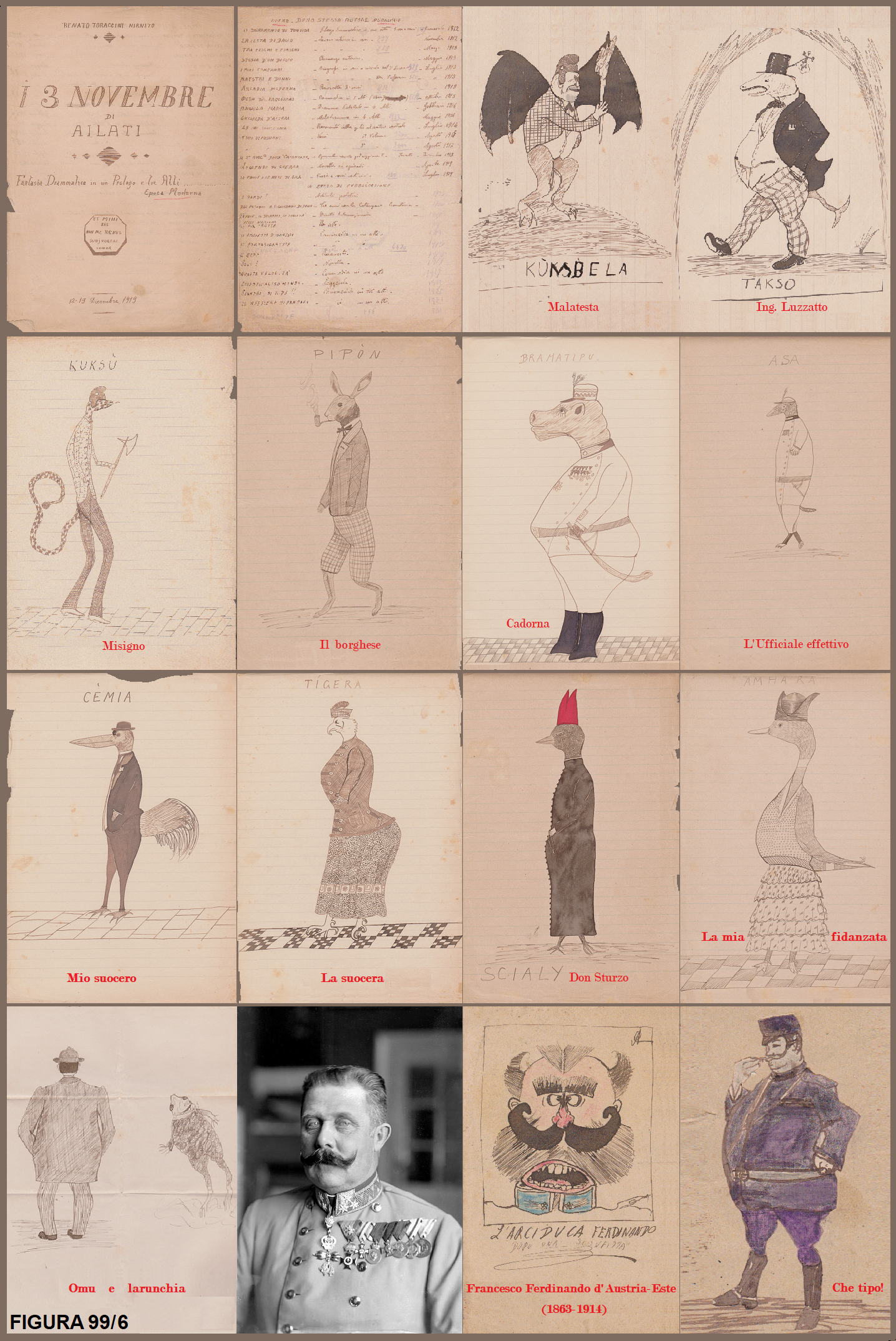 La figura 99/6 riproduce tutti i “bozzetti dei costumi” dei personaggi disegnati dal tenente Nino Correnti. E sono proprio questi disegni che mi sono sembrati notevoli, spiritosi e significativi, tanto più in quanto opera d’un avvocato senza una formazione scolastica artistica, per cui ho voluto farli conoscere agli Amici del Blog e, se sarà possibile, ad un pubblico più vasto. Il contenuto della «fantasia drammatica», per come l’ho interpretata, rispecchia il clima del tempo e le riflessioni di un giovane reduce di guerra, dopo quattro anni terribili e indimenticabili (Nota 3), ma ne riporto solo alcune parti, da leggere considerando le mie premesse, tralasciando in questa sede gran parte dei 4470 versi contenuti nelle 168 fitte pagine del manoscritto. Chiudo con l’elenco dei personaggi: