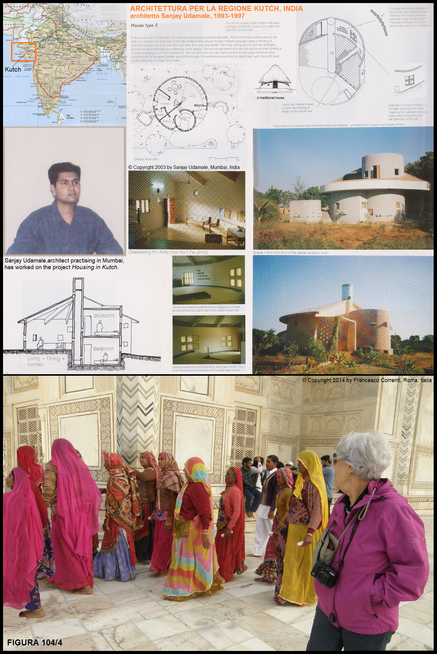 Ancora nella figura 104/3, quindi, i lettori vedono la pianta del Taj Mahal, ripetuta in vari modi per evidenziare il diverso modo di analizzare e percepire gli spazi interni. Un paio di miei schizzi e alcune foto di persone “speciali” incontrate nel viaggio (tra le migliaia scattate) e, infine, la “sorpresa” che ho avuto, dalla quale è scaturito il titolo e l’occasione per questa rubrica che è sempre alla ricerca di spunti che possano avere un minimo di interesse per i lettori. Come sempre nei nostri viaggi “di studio e di scoperta”, abbiamo cercato non solo le architetture tradizionali, i monumenti più caratteristici della civiltà indiana, di cui purtroppo (come per tutte le altre) nelle nostre scuole si studia assai poco, ma soprattutto le realizzazioni moderne e contemporanee, in particolare nel campo dell’edilizia abitativa, che è sempre uno degli temi più frequentati da noi architetti. Ed ecco la sorpresa: acquistando un volume sull’architettura della regione che si trova all’estremità occidentale della penisola indiana, il Kutch (mai sentito prima! che vergogna!), scopro che un giovane architetto moderno, Sanjay Udamale, autore del volume, ha disegnato e poi realizzato il progetto d’un quartiere di quella che noi chiamiamo “edilizia economica e popolare” che aveva delle forme – nelle piante e nelle volumetrie – molto simili a quelle del mio progetto della Pantaforna. I lettori possono constatare queste somiglianze nella figura 104/4, dove ho messo la cartina con la regione, il ritratto del collega indiano, le immagini del suo libro (Copyright 2003 by Sanjay Udamale, Mumbai, India) e, in chiusura, una foto di Paola al Taj Mahal, con un gruppo di altre visitatrici in “sari” molto eleganti.