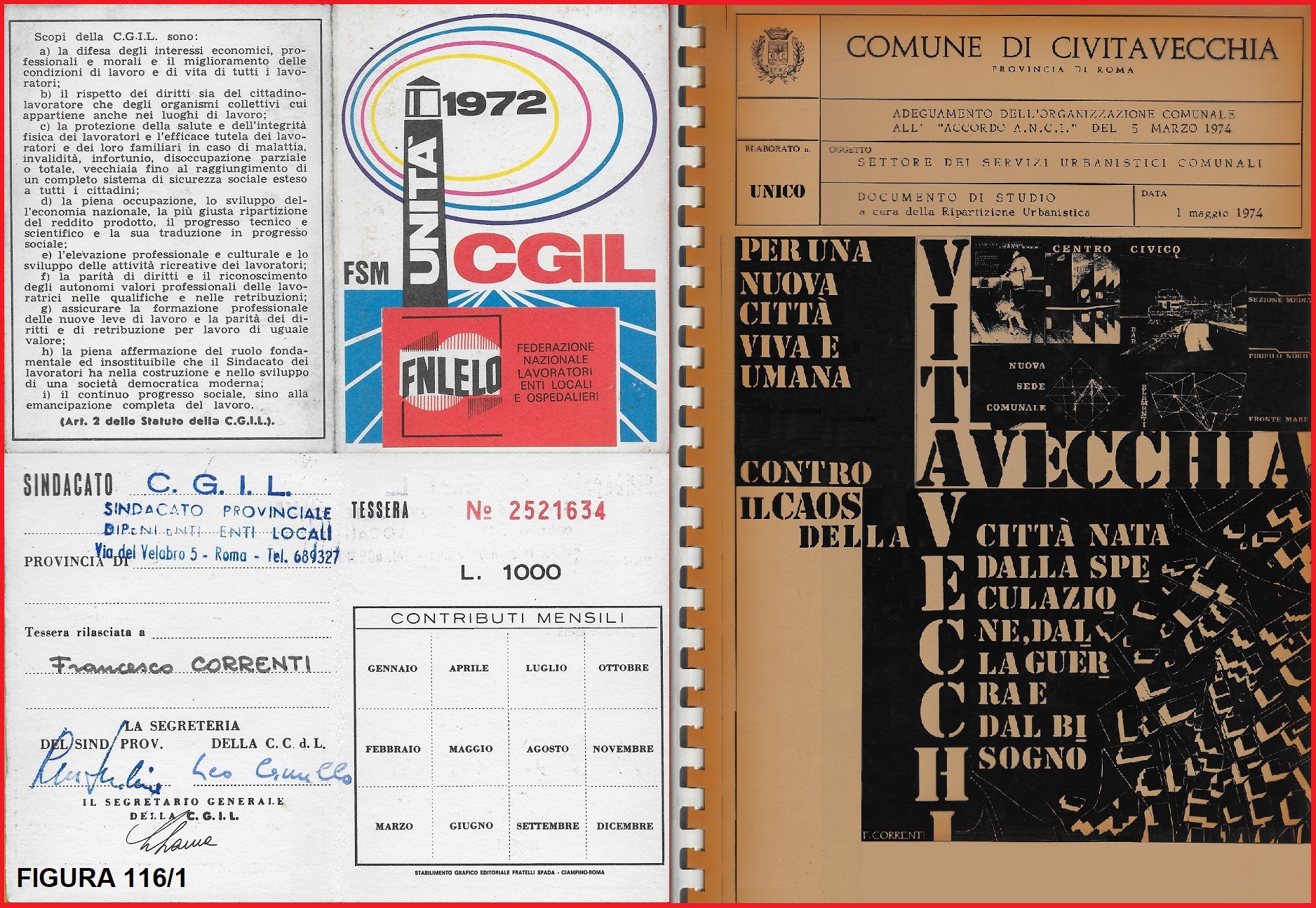 Nella Figura 1 ho riprodotto la mia tessera del sindacato e la copertina intera del fascicolo, con una tavola della mia tesi di laurea su Civitavecchia ed una planimetria emblematica del caotico tessuto urbano (la zona di via Tevere) che si era venuto formando a monte del viale Baccelli, la circonvallazione del nucleo antico e della “espansione francese”, ancora con ampi spazi inedificati.