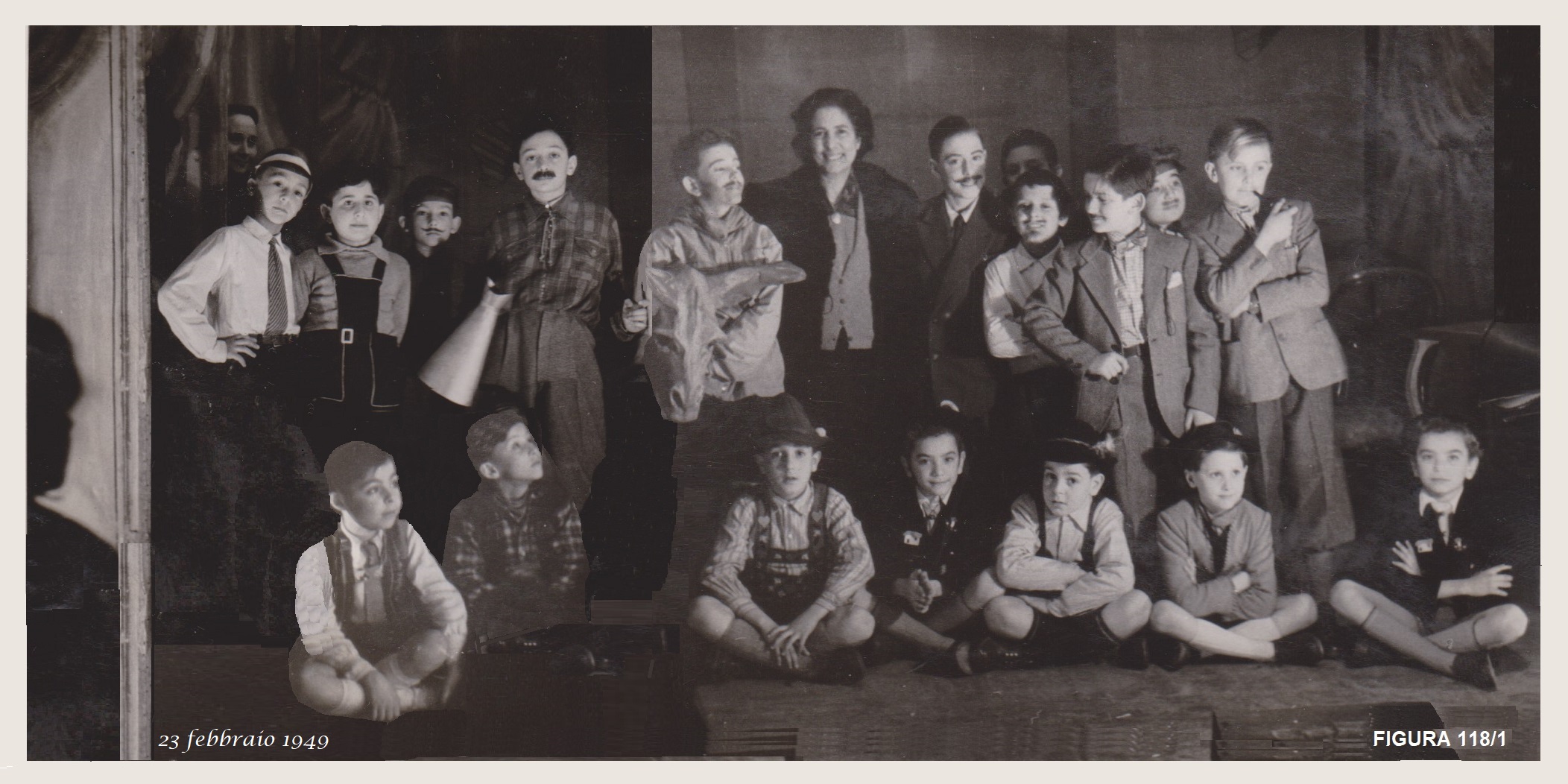 Il giorno dopo ho deciso come procedere in questo articolo, partendo da due angolazioni che mi si erano affacciate alla mente, così, senza un preciso “perché”: una prima si riferiva ad alcune foto dei miei primi anni scolastici (che come tempi coincidevano proprio con il periodo del secondo dopoguerra di cui si occupava il Bollettino SSC, dal 1945 al 1950, più o meno, che erano anche gli anni della mia scuola elementare all’Istituto Maria Adelaide di via Milano, quella via che dopo l’incrocio con via Nazionale – dove abitavo – proseguiva nel Traforo Umberto I, sotto il Quirinale. Una vicinanza che per circa un anno (nel ’45 ero in prima elementare), mi fece avere due “compagne di scuola”, in classi diverse e con loro frequenza, se ben ricordo, piuttosto saltuaria, di una certa quale altezza, anzi, a dir meglio, di certe “Loro Altezze”… Le foto riguardano una recita di una qualche pièce, penso ideata per il Carnevale dalla maestra Monachesi, ispirata in qualche modo al Guglielmo Tell di Gioachino Rossini, che si tenne il 23 febbraio 1949. Avevo appena compiuto dieci anni e la mia parte era quella del regista teatrale proprio della recita, un ruolo da caratterista, che dava ordini alla troupe balbettando e storpiando le parole. Per la copertina del dossier, ho subito associato la mia foto con megafono allo spaccato del Teatro Traiano disegnato pochi anni addietro. L’altra angolazione, solamente di richiamo o assonanza verbale, era l’indimenticabile sigla televisiva di chiusura della storica trasmissione «Teatro 10», “cantata e parlata” nel 1972 da Mina Mazzini e Alberto Lupo. Di anni, allora, ne avevo 33.